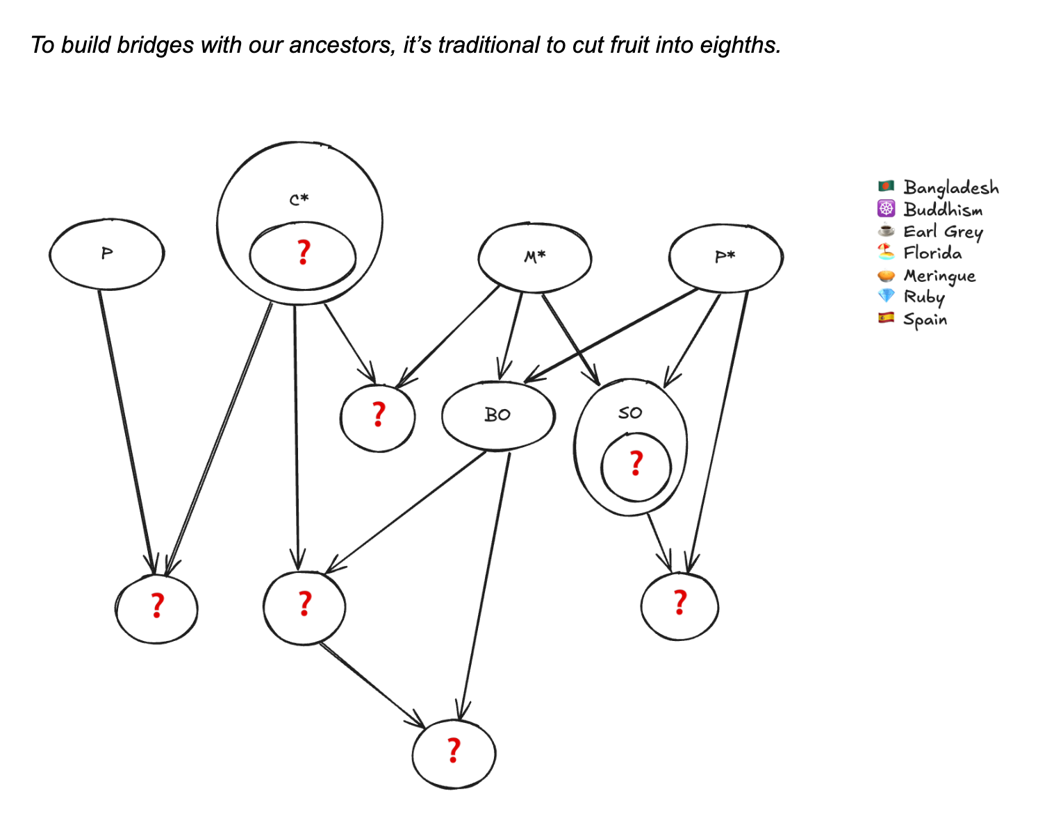 One theme that’s shown up in my nerdy food system reading is that our food system is far less diverse than it might seem on the surface.[2][3] A couple years ago, I discovered that most citrus descended from just three fruits: citrons, mandarins, and pomelos! This fact surfaced again on my Reddit feed as a taxonomy diagram — right when I was exploring puzzle ideas for Mystery Hunt. At that point, I fully committed to somehow featuring citrus ancestry in a puzzle.