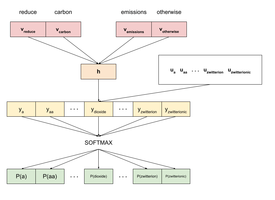 $$ \begin{align*} \mathbf{h} &= \frac{1}{C} \sum_{i=1}^C \mathbf{v}_{w_i} \\ \mathbf{y} &= U^{T} \mathbf{h} \\ P(w\,|\,\text{context}) &= \frac{e^{y_{w}}}{\sum_{j=1}^n e^{y_{j}}} \end{align*} $$