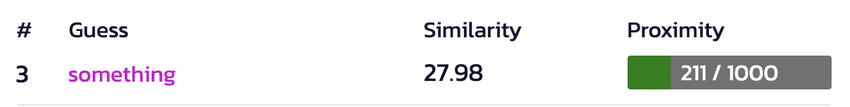 - After each guess, the game outputs a similarity score, which represents how close the guess is to the target. If our guess is in the closest 1000 words to the target, then the game will tell us what rank that guess is, called the proximity.
