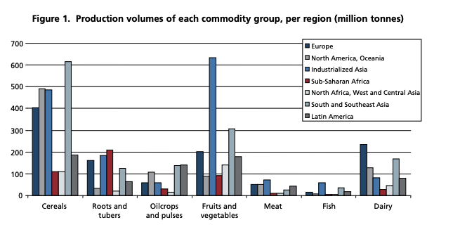The below charts come from FAO. By weight, we produce the most cereal crops (i.e. grains), followed by fruits + vegetables, so the majority of food wastage comes from cereal crops.