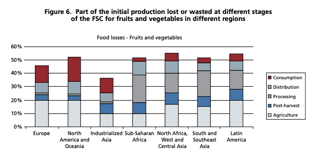 The proportions differ depending which part of the world we’re looking at. ReFED breaks down the percentage lost/wasted at each supply chain step. Note that while waste in the home occupies the highest percentage, that waste could’ve been prevented by smarter decision-making earlier in the supply chain. A grocery store with strawberries nearing perishability might advertise a steep discount to clear that inventory, leaving the consumers to throw out any spoiled strawberries.